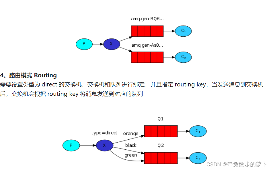 Routing模式要求队列在绑定交换机时要指定routing key,消息会转发到符合routing key的队列。