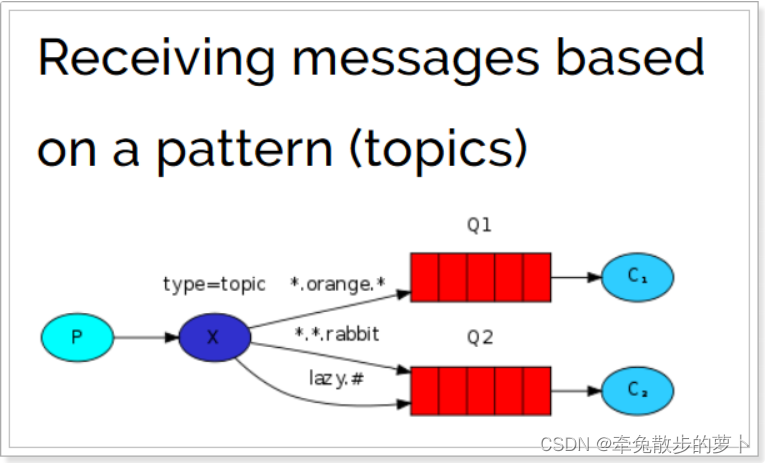 - Topic:通配符,把消息交给符合routing pattern(路由模式) 的队列