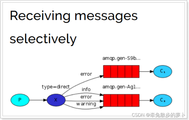 - C2:消费者,其所在队列指定了需要routing key 为 info、error、warning 的消息