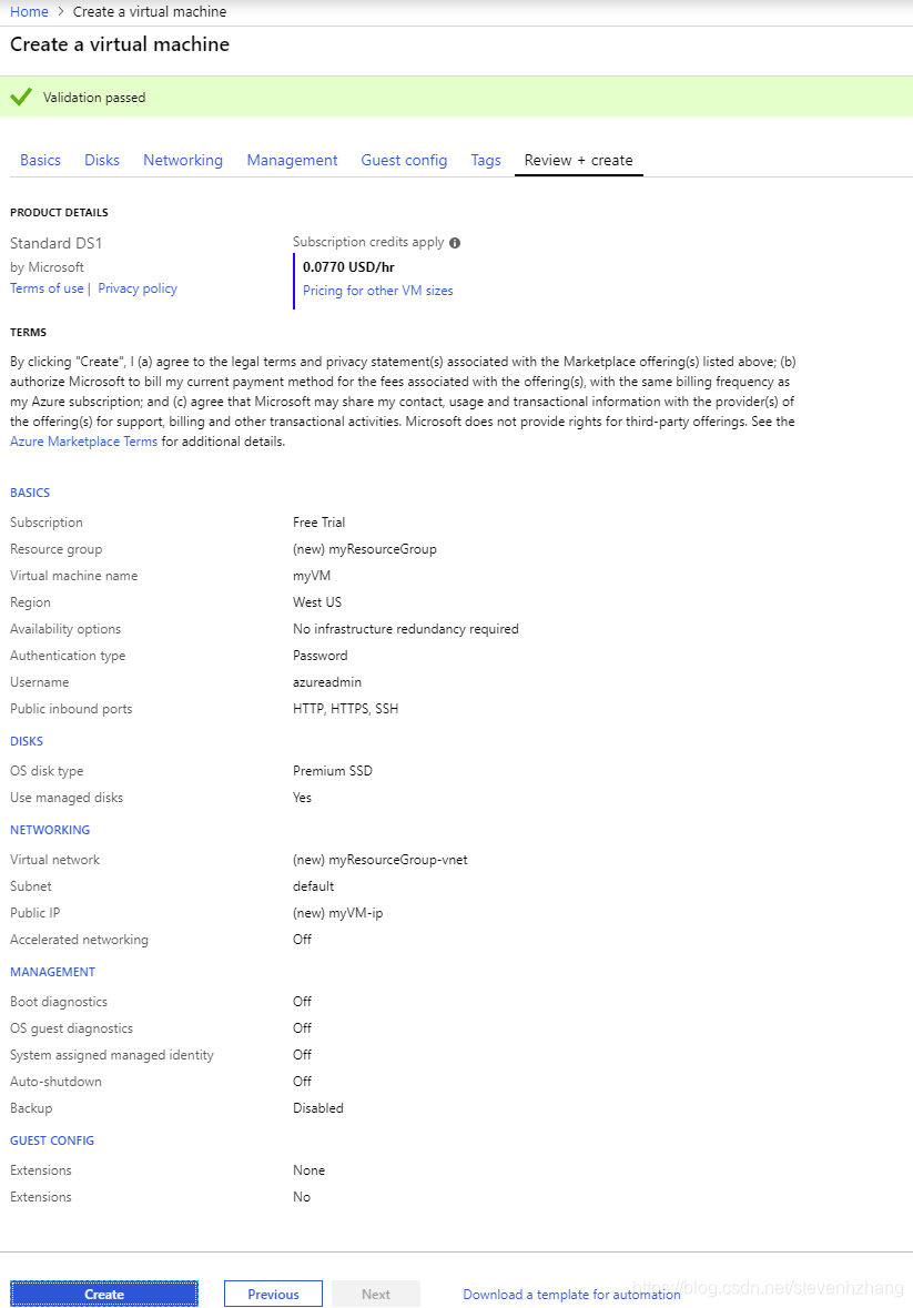 2)【Public IP】 公共IP地址。示例使用自动生成 myVM-ip