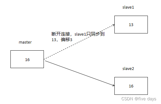 这是因为每个节点都会保存数据的偏移量,那么就有可能出现slave跟master网络断开一小会,然后发起数据同步的场景,如图所示: