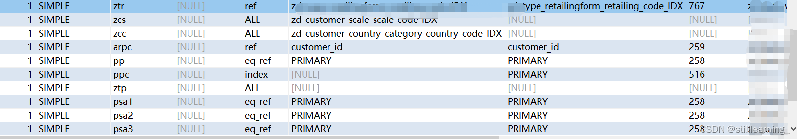 有了思路再回头看下我们这个sql的思路,zc.*由于业务需要肯定是需要全表查询了,关联的表非常的得多,但是大部分都是字典表,一般都会走逐渐索引,字典表记录较少的也会走全表扫描,但是里面也只有俩三条记录(mysql会自动帮我们做一些优化,对记录比较少的表加索引也只会浪费空间),事实上看执行计划也确实是如此。关联条件一般也都是通过逐渐id关联。