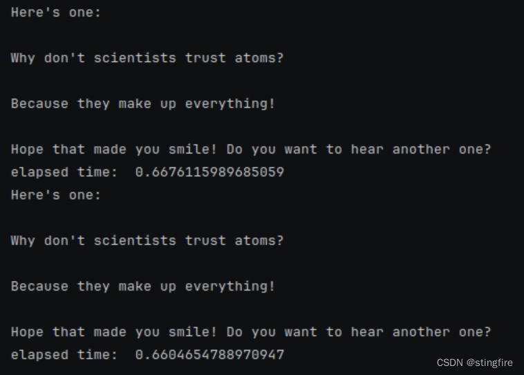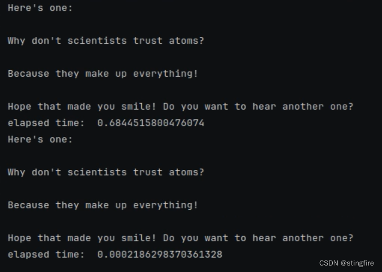 上面代码中set_llm_cache(InMemoryCache())即完成了缓存设置。运行结果如下,可以看出第二次使用了缓存结果,时间大大缩短: