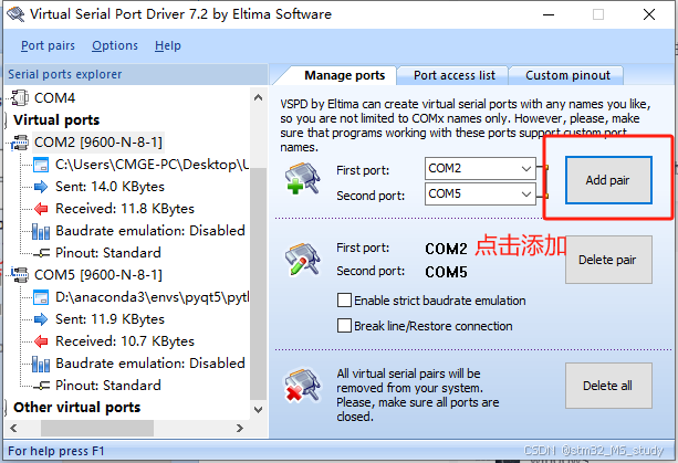 为了方便实验,这里我们用一个VSPD 7.2软件先为电脑提供两个COM口,并让两个COM口相连,打开软件,操作的方法如下:
