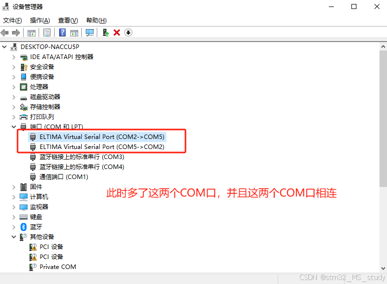 添加完成以后,点开设备管理器,能看到下面的COM2和COM5相连