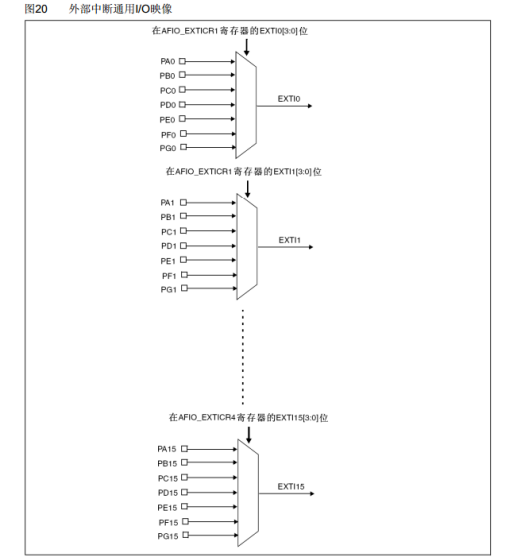 所有GPIO口,但相同的Pin不能同时触发中断(如下下图,相同pin的引脚连接的时同一个EXTI通道)