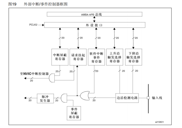 //当中断条件(如引脚电平变化)满足时,STM32的EXTI(外部中断/事件控制器)会将对应中断线的挂起位(位于PR寄存器中)置1