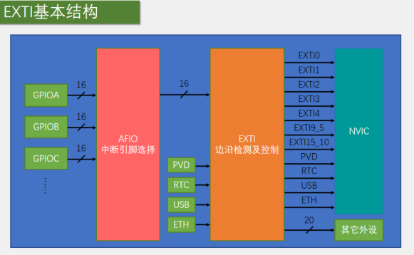 EXTI可以监测指定GPIO口的电平信号,当其指定的GPIO口产生电平变化时,EXTI将立即向NVIC发出中断申请,经过NVIC裁决后即可中断CPU主程序,使CPU执行EXTI对应的中断程序
