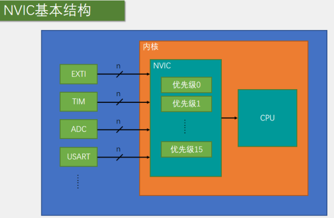 使用NVIC统一管理中断,每个中断通道都拥有16个可编程的优先等级,可对优先级进行分组,进一步设置抢占优先级和响应优先级