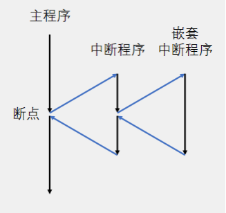 当一个中断程序正在运行时,又有新的更高优先级的中断源申请中断,CPU再次暂停当前中断程序,转而去处理新的中断程序,处理完成后依次进行返回