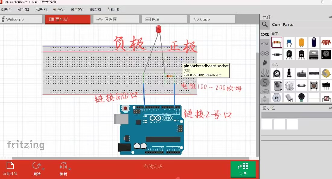 LED灯长的一端为正极,短的一端为负极,正极连在电阻上面,UNO开发板2号口连在电阻下面,GND口连在负极下面(如图)电阻在家用电(220V)用100—200欧姆看个人喜好。