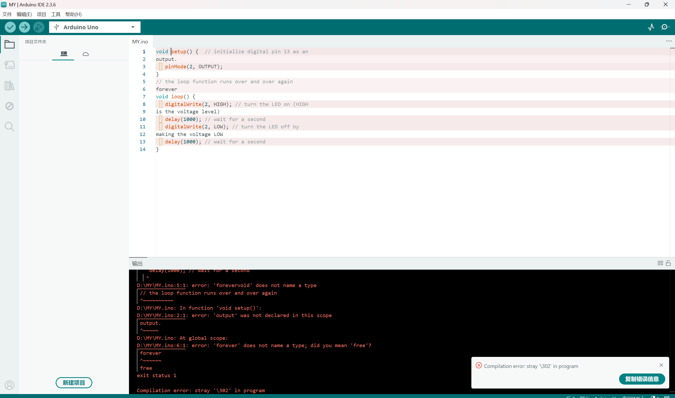 解决将 digitalWrite(2 HIGH)改成digitalWrite(5, HIGH) 将digitalWrite(2 LOW)改成digitalWrite(5, LOW)