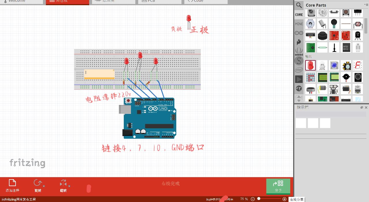 LED灯长的一端为正极,短的一端为负极,正极连在电阻上面,UNO开发板2号口连在电阻下面,GND口连在负极下面(如图)电阻在家用电(220V)用220欧姆,接着用杜邦线将3个发光二极管的长脚连接到开发板的4,7,10接口(如图)