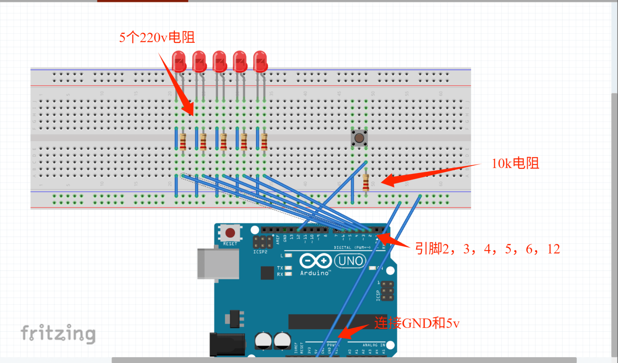 注意一定是10K电阻,因为电阻帮隔绝电压,防止UNO板子烧坏(具体原理可以看上一篇)