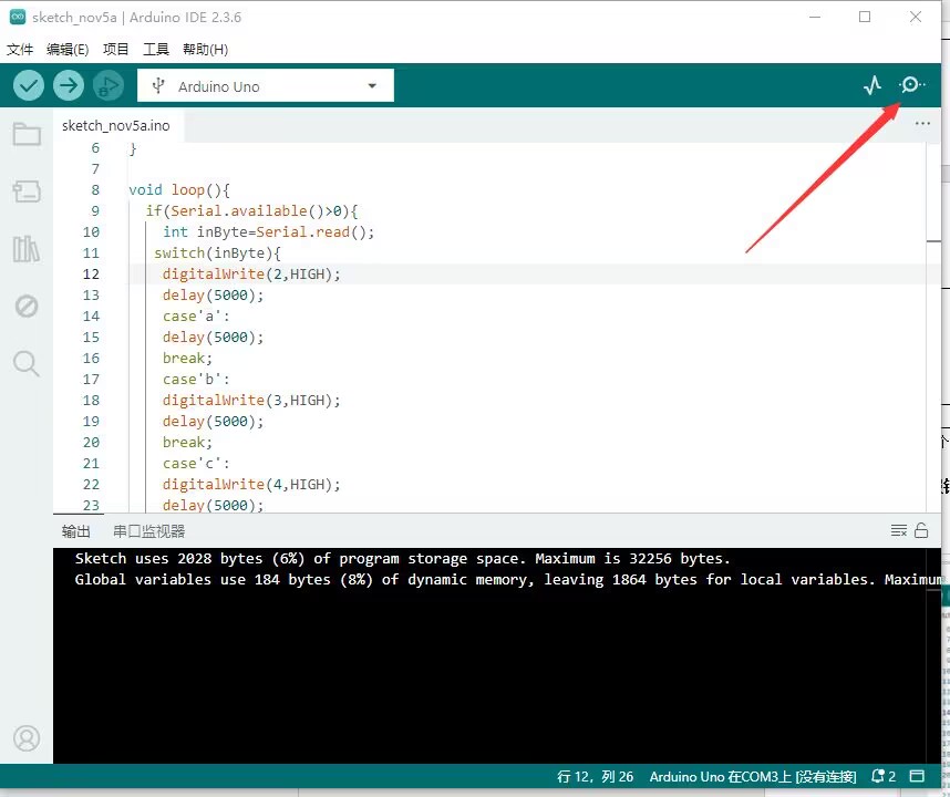 int inByte=Serial.read();是从串口读取1个字节的输入数据,并存入整型变量inByte中,比如从串口监视器输入(a,b)。
