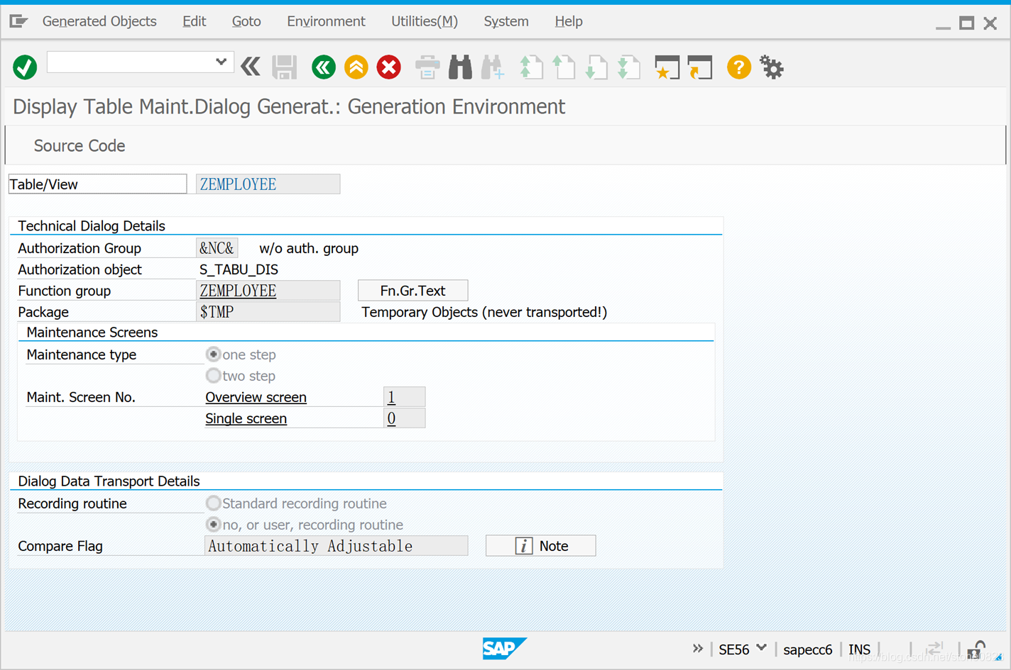 为了方便对数据表的数据维护,最好能提供维护的界面。表维护生成器 (Table maintenance generator) 是 SAP 对数据表提供的一种通用方法,在 SE1 界面,通过菜单 Utilities -> Table Maintenance Generator 进行设置。设置界面如下: