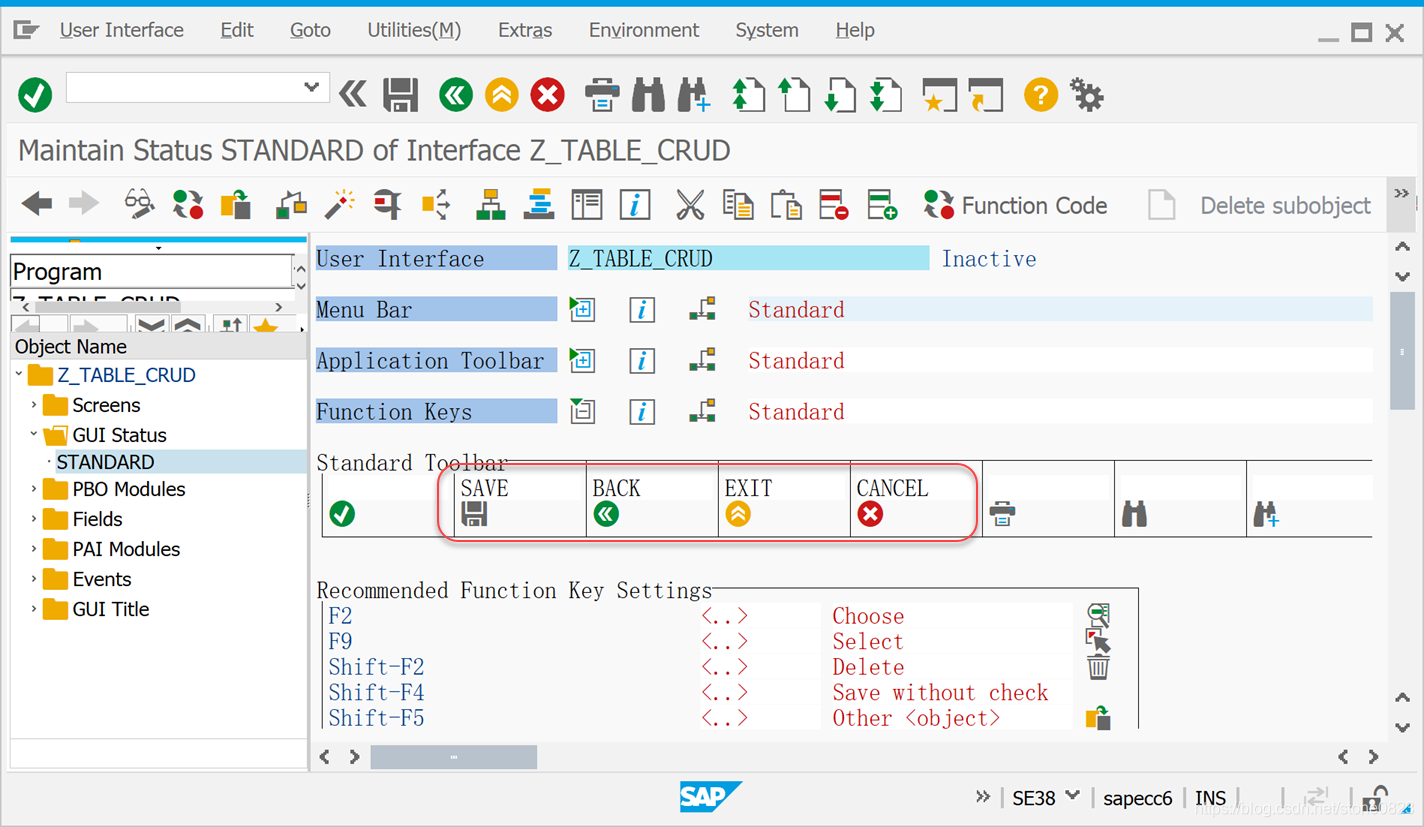 第一步,创建一个编号为 2000 的 Screen,创建一个名为 STANDARD 的 GUI Status, 在 Function Keys 部分,设置 4 个按钮如下图所示: