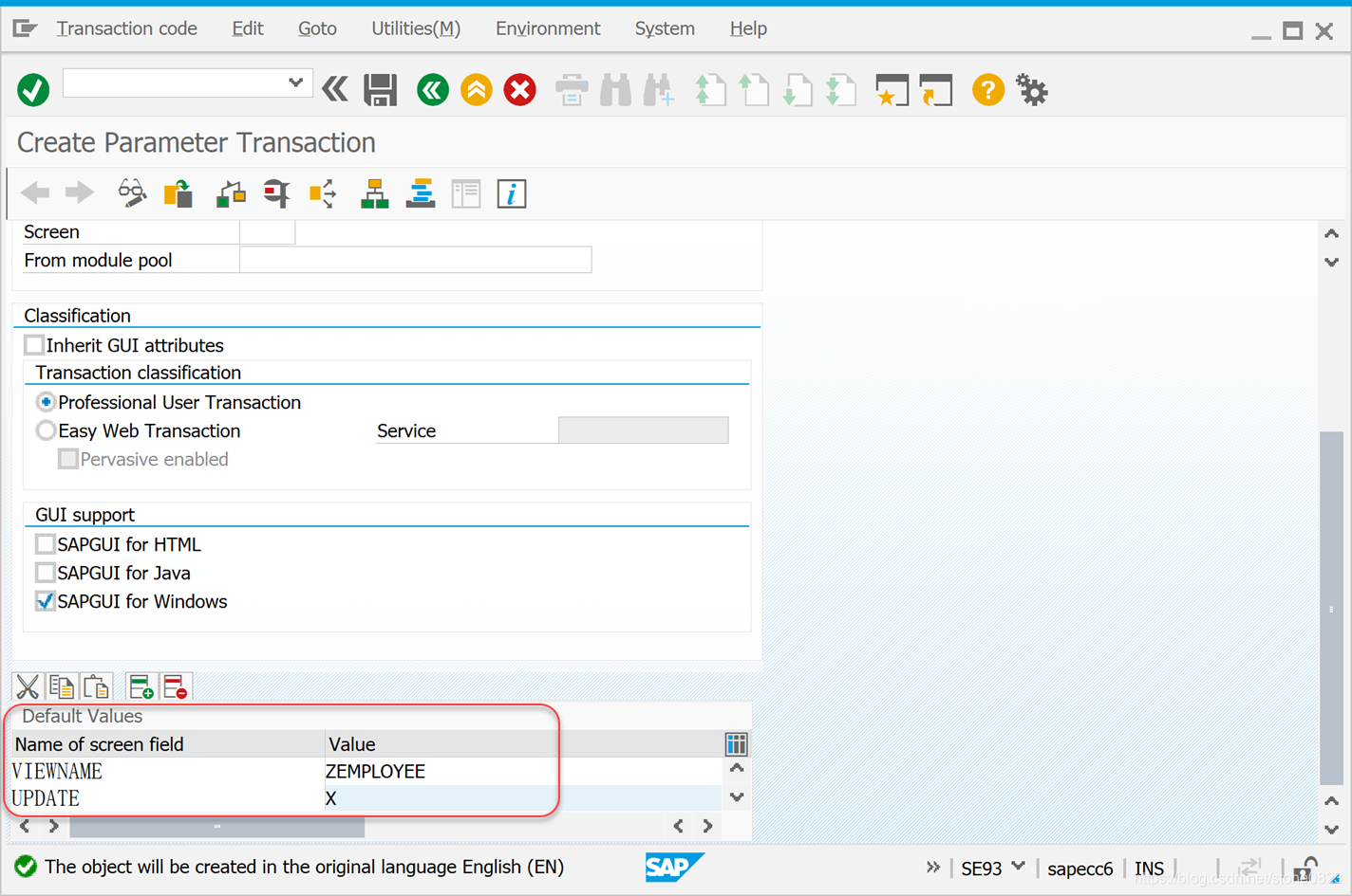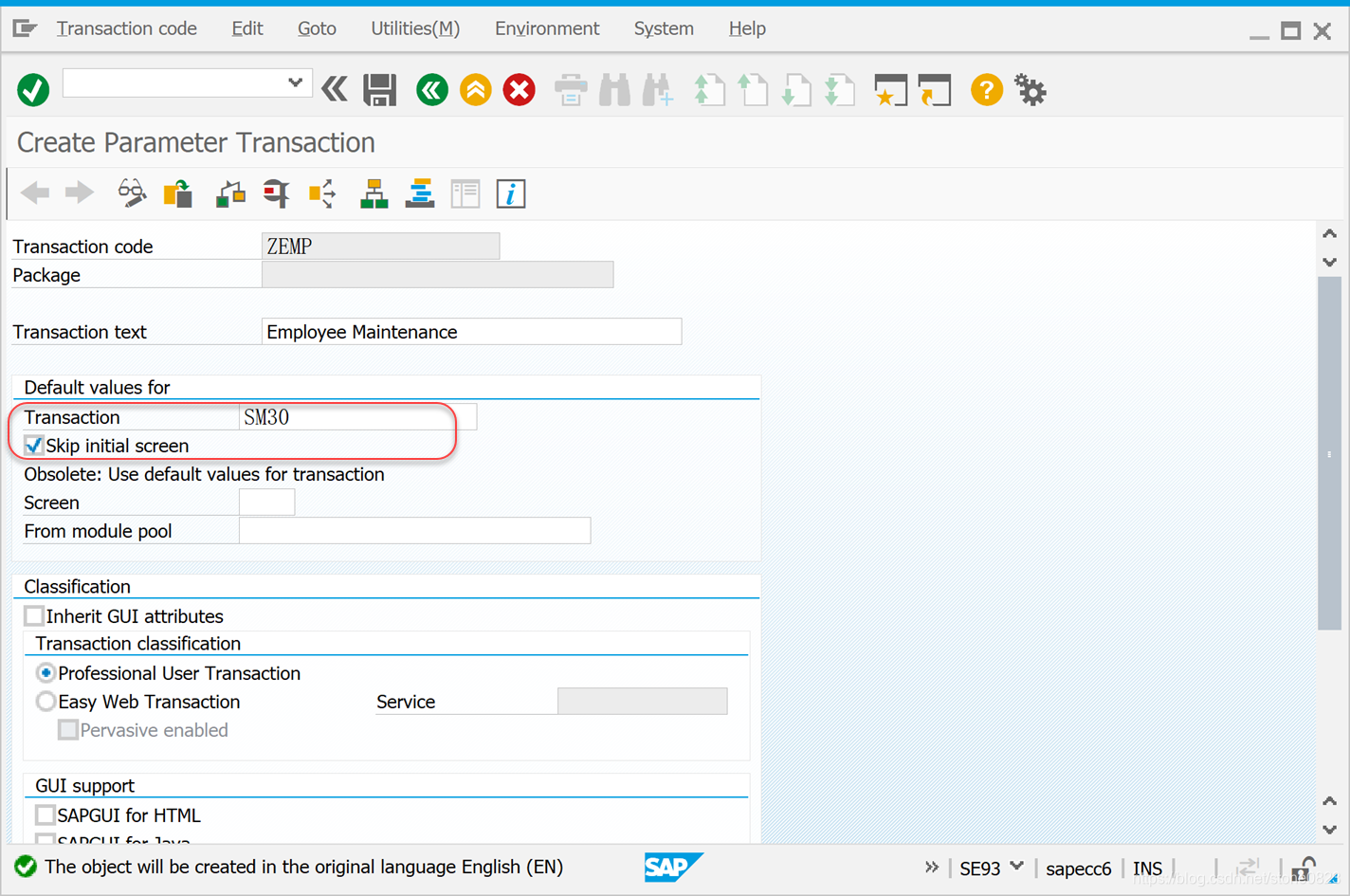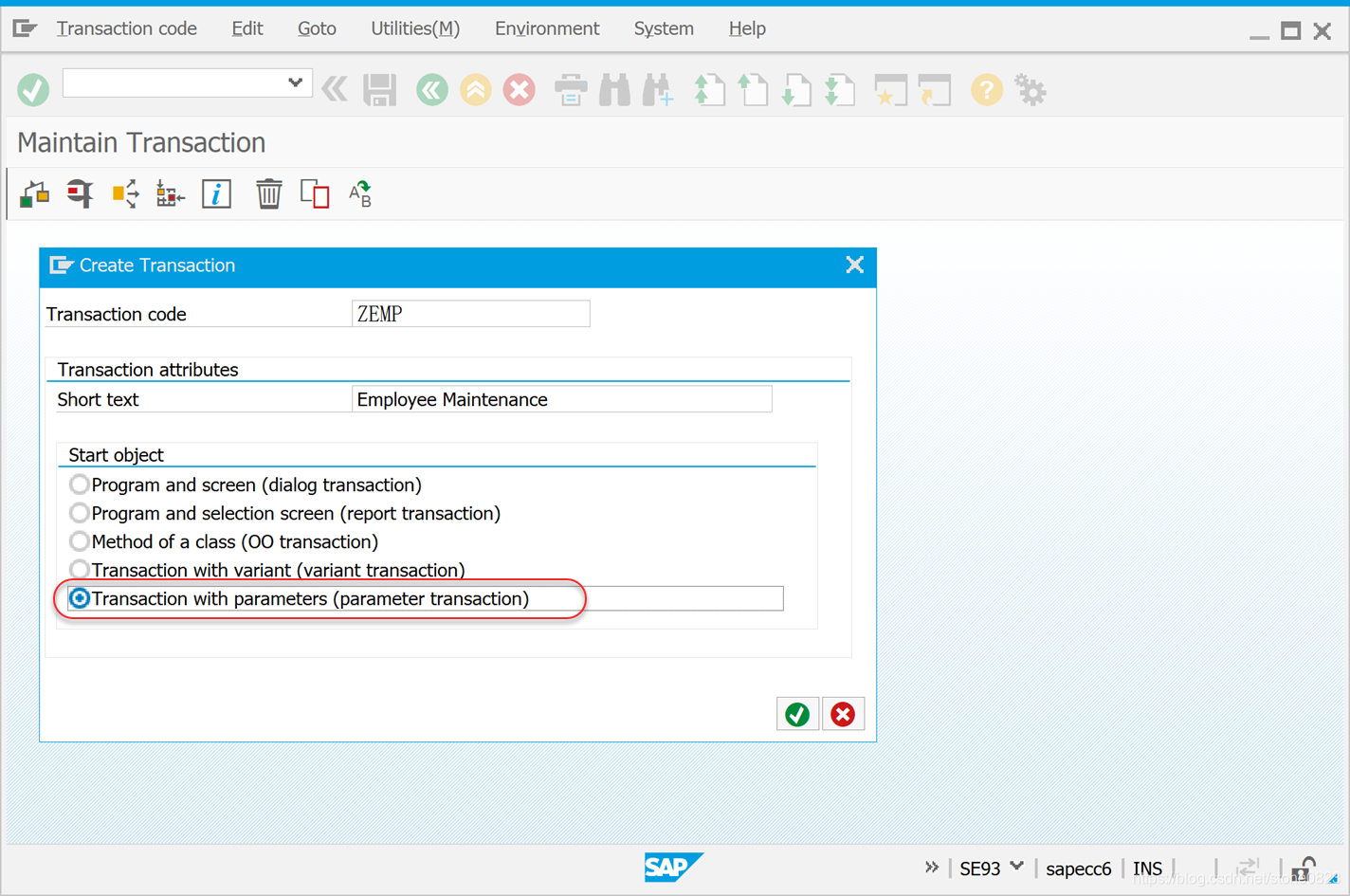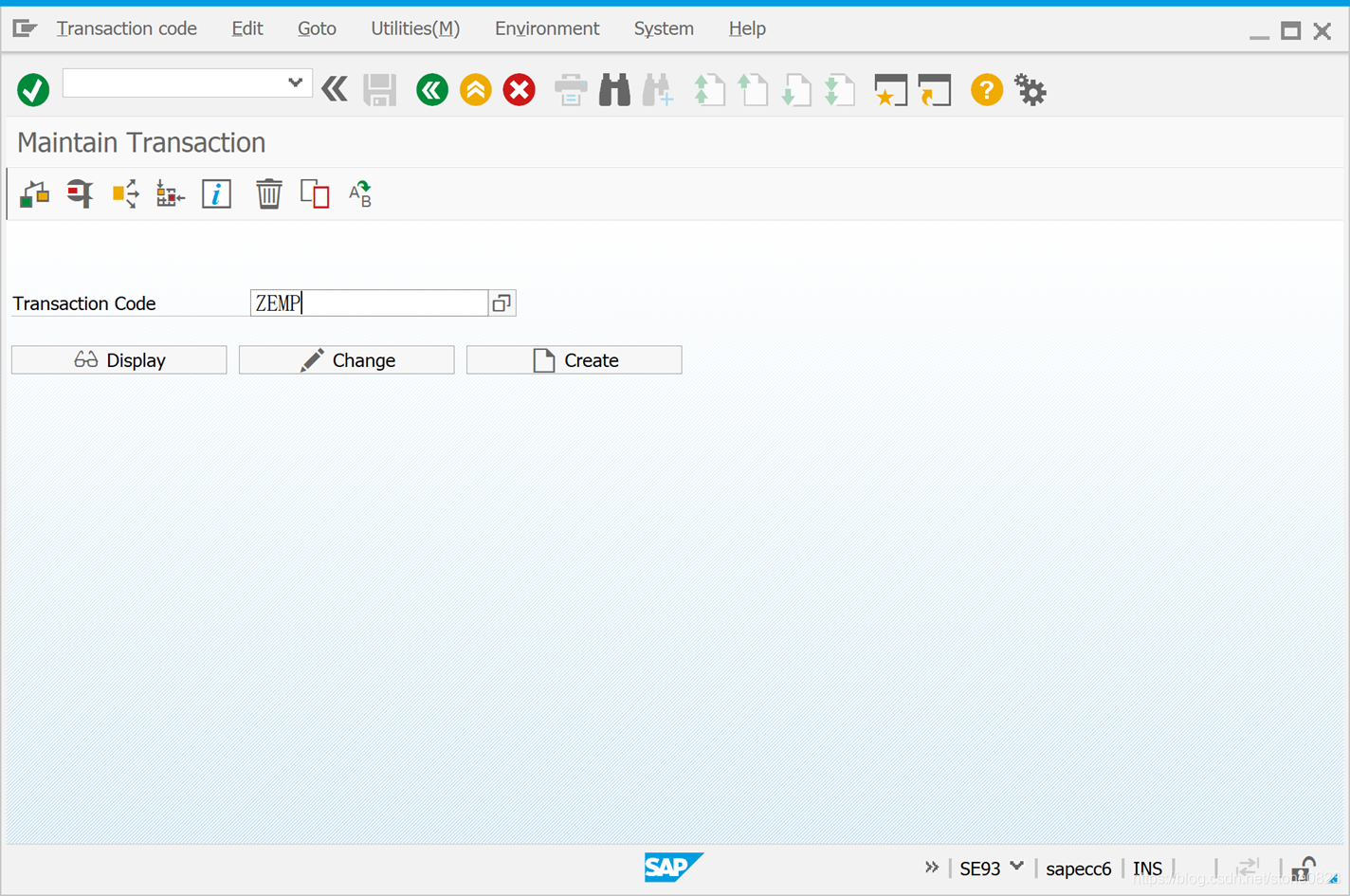 使用事务码 SE93 进入界面,在 Transaction Code 字段输入 ZEMP,点击创建按钮。