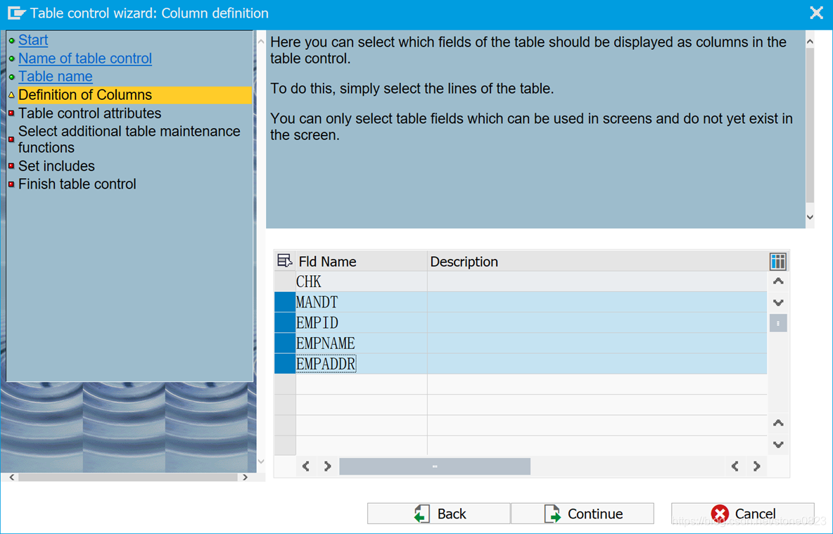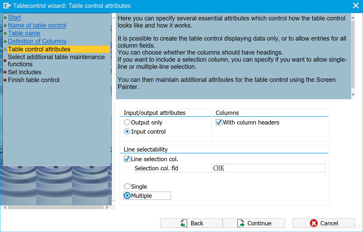 - Line selection column: 选 CHK,选择字段必须为 C,长度为 1