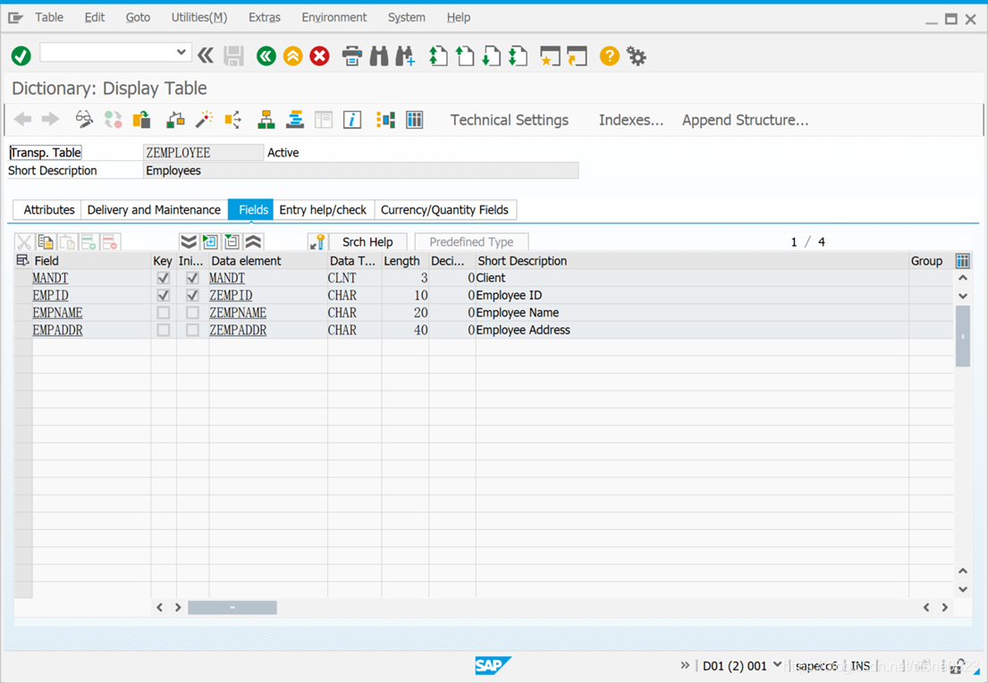 本文介绍如何对SAP数据库表进行增删改查操作,重点是说明如何为数据的增删改查提供编辑界面。假定现在要对 zemployee 表进行增删改查操作。表的字段如下: