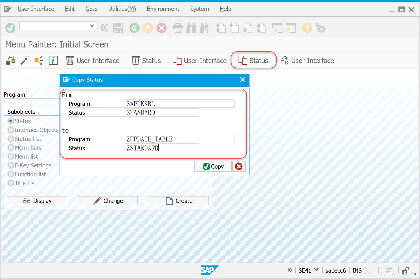ALV 内置的工具栏没有与保存相关的按钮,解决办法是拷贝一个工具栏,让 ALV 控件关联拷贝的工具栏。使用事务码 SE41 从程序 SAPLKKBL 拷贝 STANDARD 工具栏到本程序。