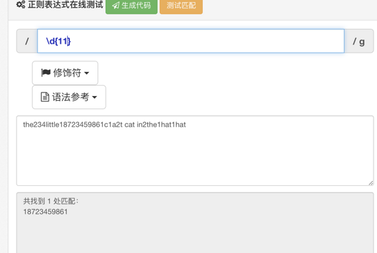 后面加上数字表示连续出现的次数,如\d{11}表示单个数字出现11次,也就是手机号