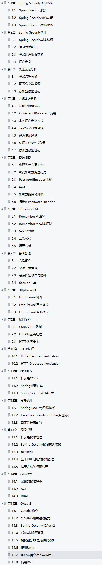 所以借此机会今天LZ给大家带来一份近期在架构师社区疯传的SpringSecurity进阶小册,文档一共分为四部分: