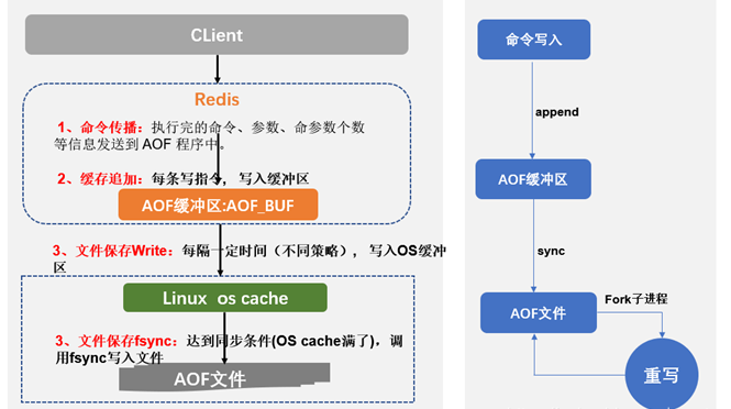 - 文件写入保存:当达到 AOF同步条件,fsync 函数或者 fdatasync 函数会被调用,将 OS Cache 中的数据写入磁盘文件。