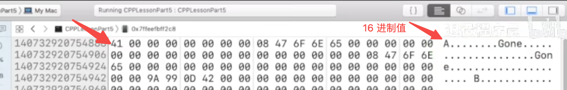 p &charA.ch #查看对象charA中属性ch的变量的类型 与 值 ,当为'\0'时代表为空字符 po &charA.ch #只打印值 -