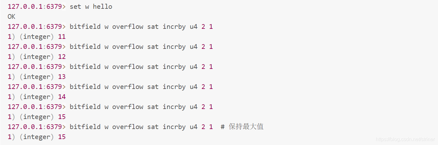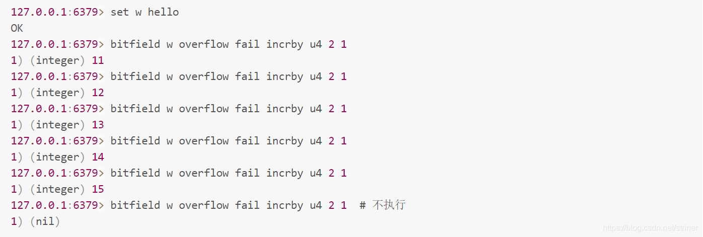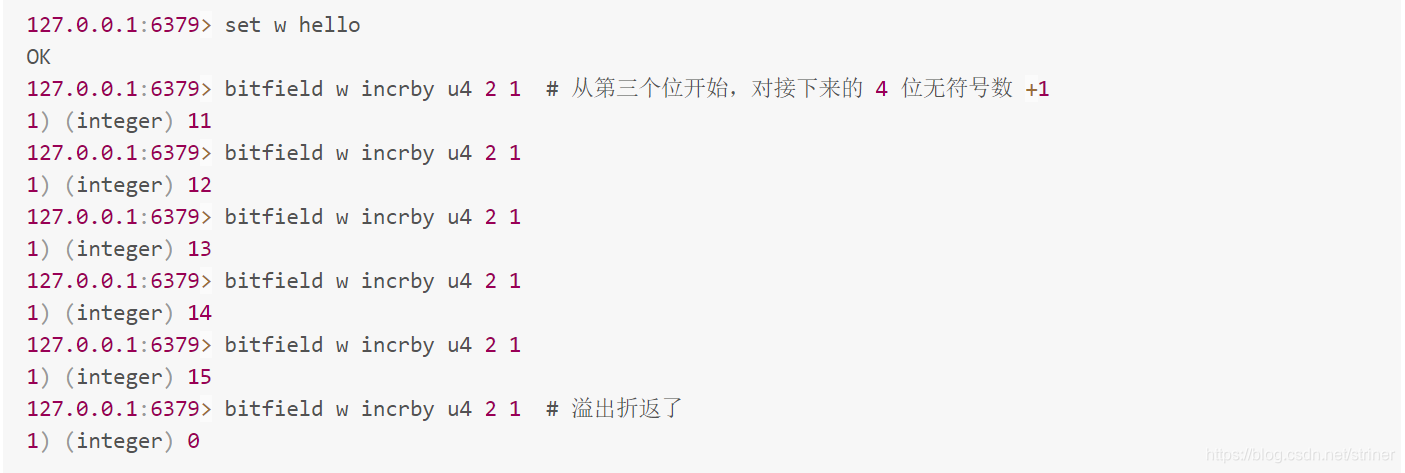 再看第三个子指令 incrby,它用来对指定范围的位进行自增操作。既然提到自增,就有可能出现溢出。如果增加了正数,会出现上溢,如果增加的是负数,就会出现下溢出。Redis 默认的处理是折返。如果出现了溢出,就将溢出的符号位丢掉。如果是 8 位无符号数 255,加 1 后就会溢出,会全部变零。如果是 8 位有符号数 127,加 1 后就会溢出变成 -128。