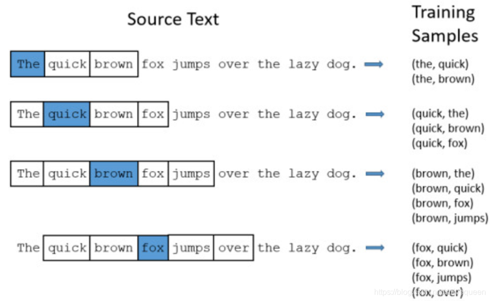 - 有了input word以后,再定义一个叫做skip_window的参数,它代表着从当前input word的一侧(左边或右边)选取词的数量。skip_window=2代表着选取input word左侧2个词和右侧2个词进入窗口,所以整个窗口大小span=2x2=4。