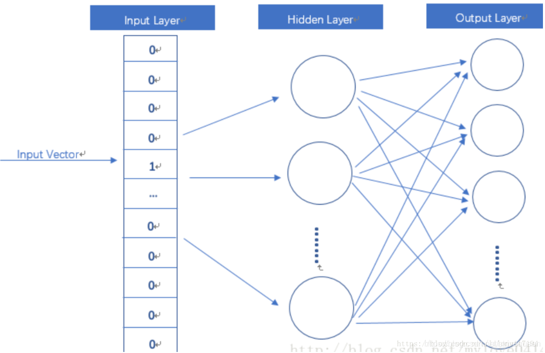 我们要获取的dense vector其实就是Hidden Layer的输出单元。有的地方定为Input Layer和Hidden Layer之间的权重,其实说的是一回事。