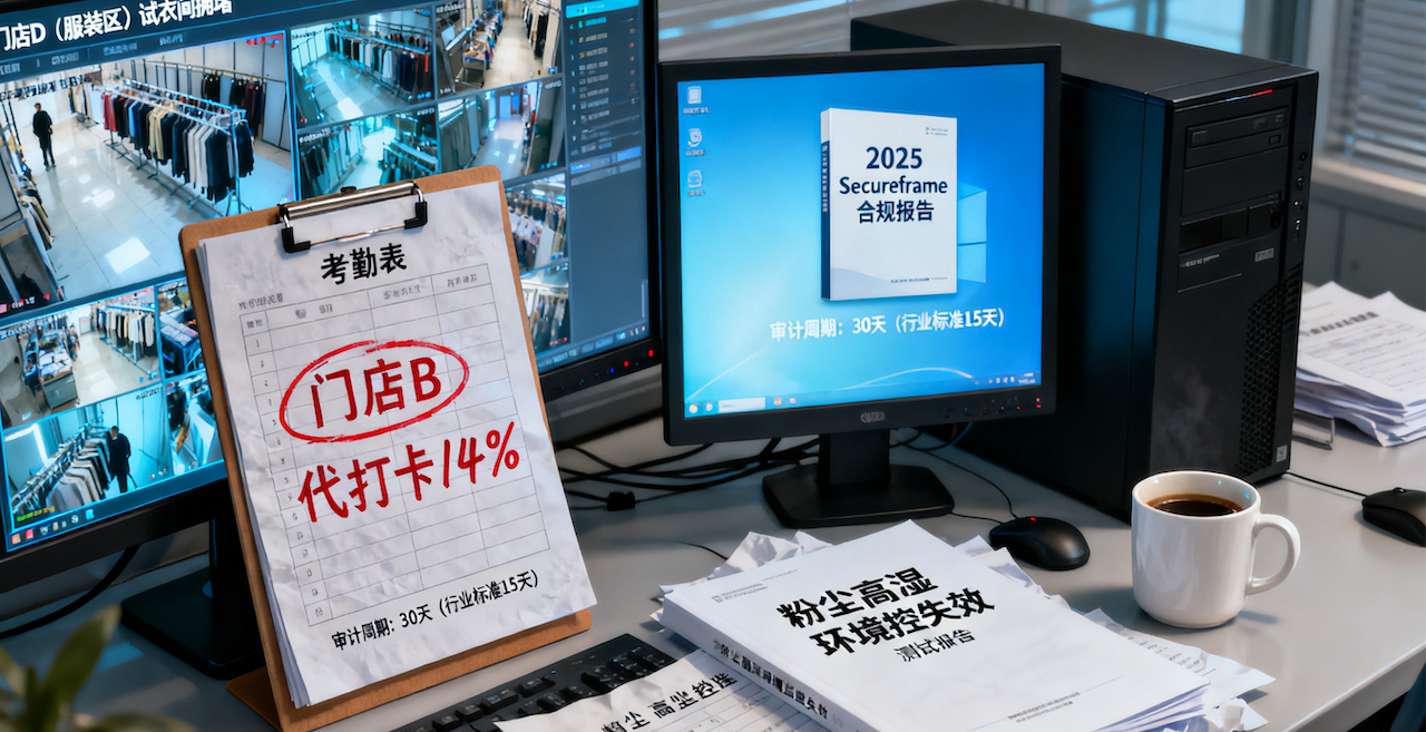 多门店连锁零售的痛点层层叠加:2025年Secureframe报告,非合规事件成本平均174K美元/起;SOP执行不一导致品牌一致性仅72%,顾客忠诚度下滑11%;跨店代打卡率14%,劳动法罚款风险激增;督导覆盖率不足35%,极端天气下(如粉尘高湿)监控盲区达20%;库存与操作脱节,浪费率17%。这些让综合体从“协同帝国”退化为“各自为政”。