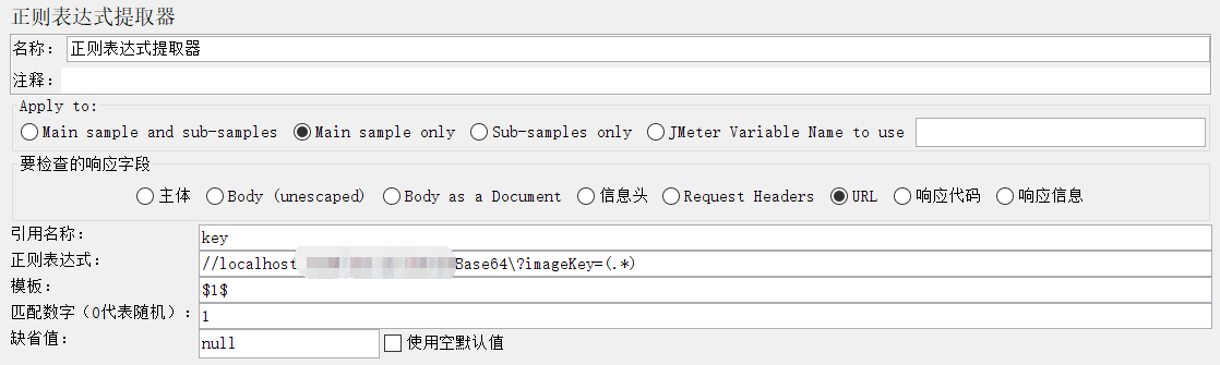 4.添加一个正则表达式提取器,提取请求参数imageKey对应值