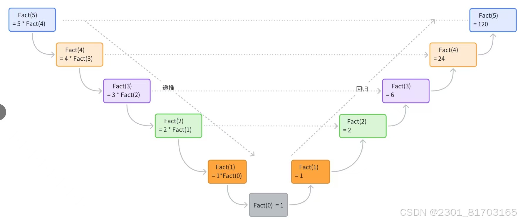 函数不返回,函数对应的栈帧的空间就一直占用,所以如果函数调用中存在递归调用的话,每一次递归函数调用都会开辟属于自己的栈帧空间,直到函数递归不再继续,开始回归,才会逐层释放栈帧空间。