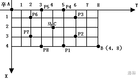 棋盘用坐标表示,A 点 (0,0)(0,0)、B 点 (n,m),同样马的位置坐标是需要给出的。