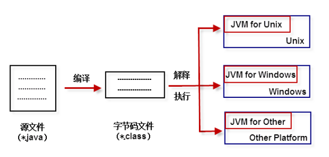 不同的操作系统有不同的虚拟机。Java 虚拟机机制屏蔽了底层运行平台的差别,实现了“一次编译,随处运行”。 Java虚拟机是实现跨平台的核心机制。如图所示: