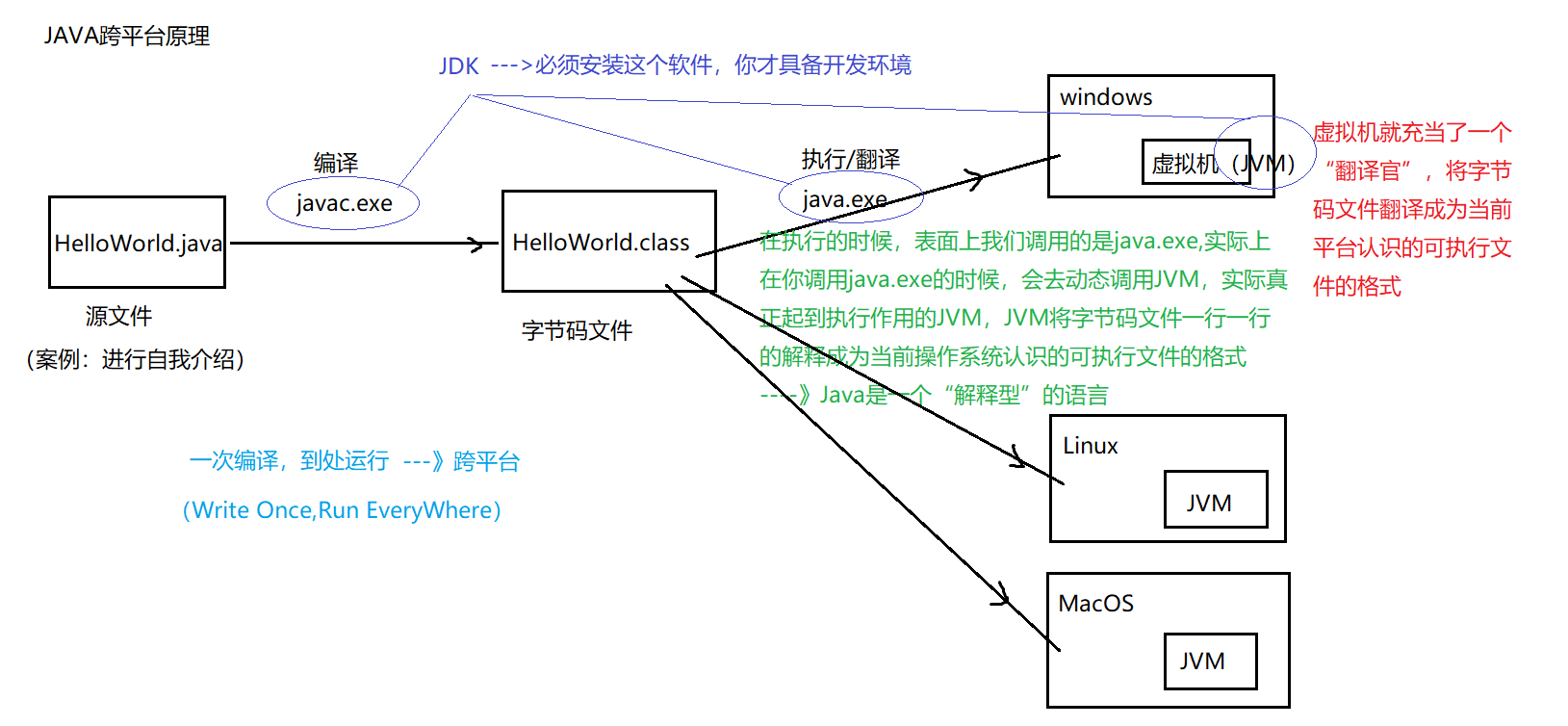 第二,Java是解释执行的,编译为中间码的编译器与平台无关,编译生成的中间码也与平台无关(一次编译,到处运行),中间码再由解释器解释执行,解释器是与平台相关的,也就是不同的平台需要不同的解释器.