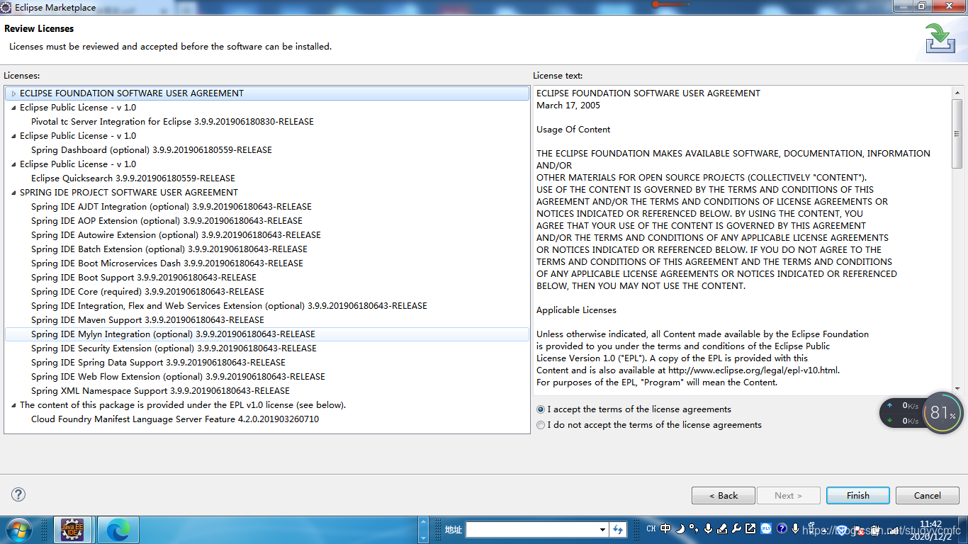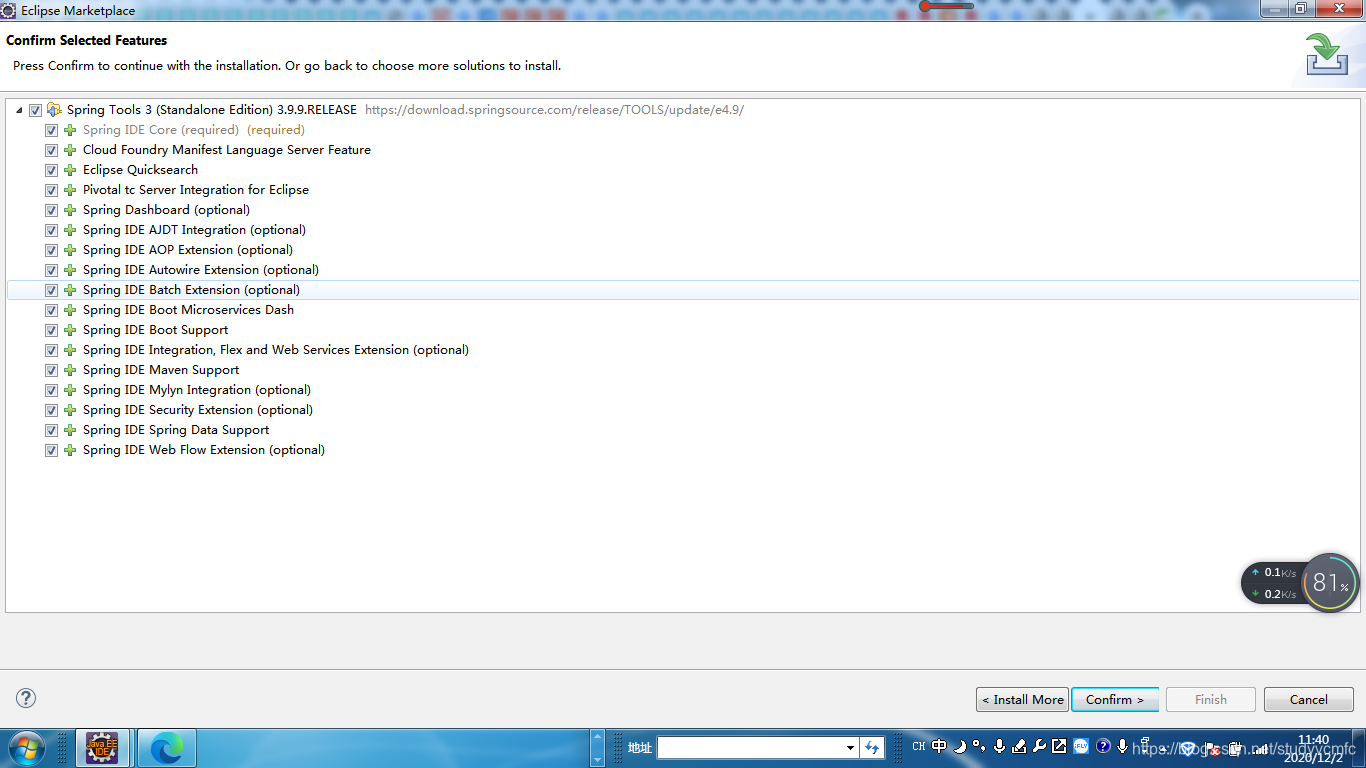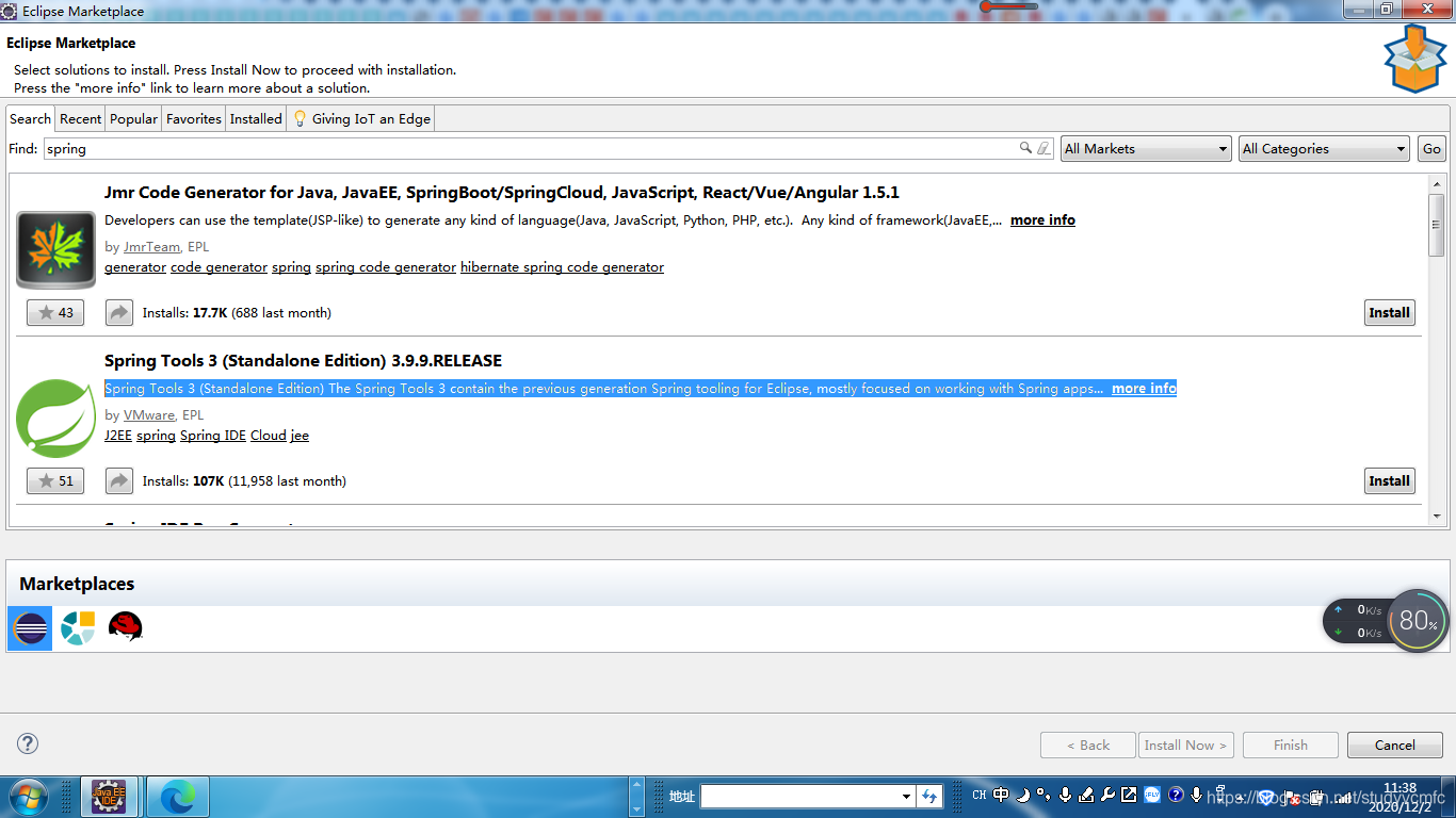 改用eclipse help的market 网上搜索安装 关键字 spring