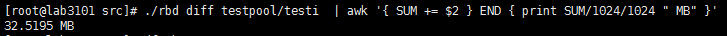 rbd diff testpool/testi |awk '{SUM += $2} END {print SUM/1024/1024 " MB"}'