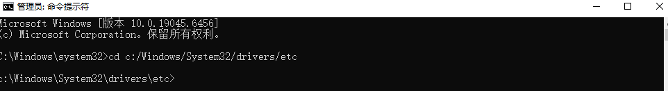 2. 在命令行窗口中输入“cd c:/Windows/System32/drivers/etc”