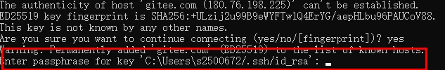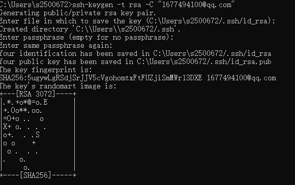 其中,出现Enter file in which to save the key (C:\Users\s2500672/.ssh/id_rsa):时表示你需要按Enter 键接受默认路径(C:\Users\s2500672/.ssh/id_rsa),或者输入自定义路径。这会创建两个文件: id_rsa (私钥,不要分享给任何人) id_rsa.pub (公钥,可以分享给 GitHub/GitLab 等)。