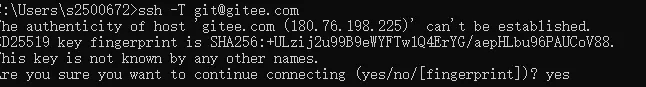 这是正常的安全验证提示,不是错误。原因是你的电脑第一次连接 gitee.com ,SSH无法验证服务器身份,需要你确认指纹。
