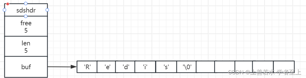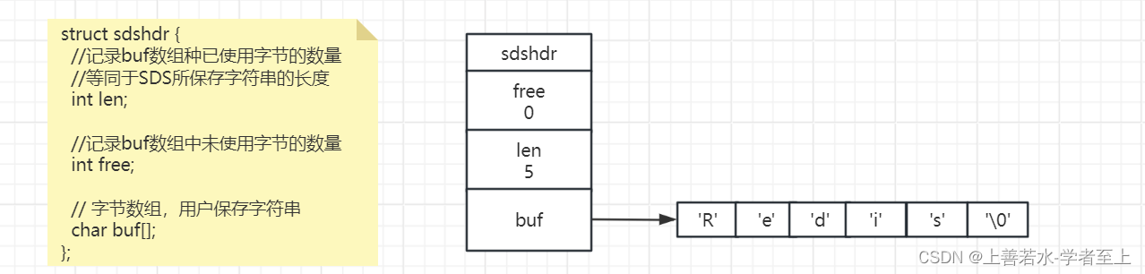 - buf 属性是一个char类型数组,数组的前5个字节保存了,'R' 'e' 'd' 'i' 's' 五个字符,最后一个保存空字符串 '\0'。SDS为了遵循C字符串规则,则结尾是以一个字节空字符串 '\0'结尾。这样SDS可以使用C的一些函数,例如 <stdio.h>/printf 函数。