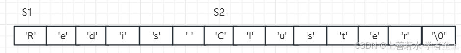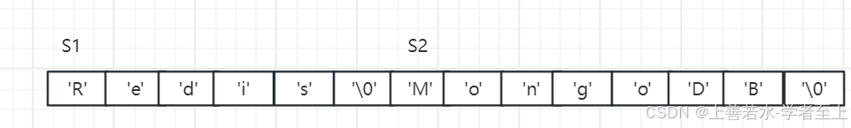 例如我们在使用C的函数 char * strcat(dest,src) 进行字符串拼接末尾的时候,假设我们拼接S1:Redis S2:MongoDB 两个字符串,已经分配了足够的内存空间,如下: