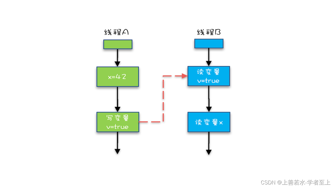 3.再根据这个传递性规则,我们得到结果:“x=42” Happens-Before 读变量“v=true”。这意味着什么呢?如果线程 B 读到了“v=true”,那么线程 A 设置的“x=42”对线程 B 是可见的。也就是说,线程 B 能看到 “x == 42”