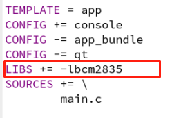 2、在 .pro 文件中添加wiringPi库 LIBS += -lbcm2835